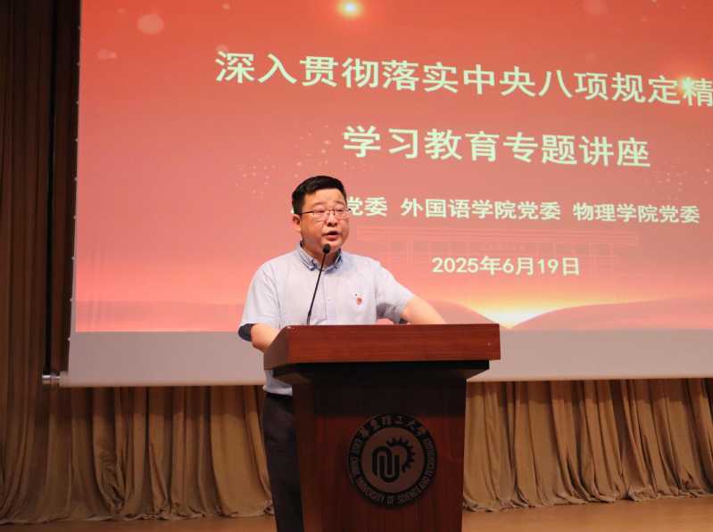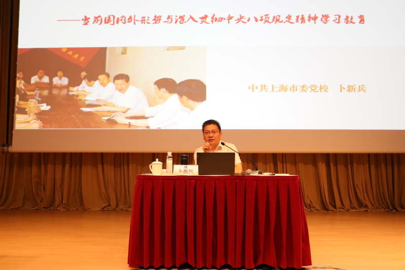 为深入贯彻中央八项规定精神学习教育,持续推进作风建设,6月19日上午,后勤党委联合外国语学院党委、物理学院党委特邀中共上海市委党校卜新兵教授作题为“一体推进学查改 锲而不舍抓作风”专题辅导报告。三个党委领导班子成员、师生党员、教师代表等共计200余人参加。讲座由后勤党委书记、后勤保障处处长陈坚主持。