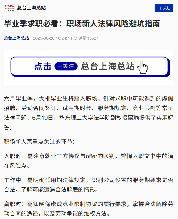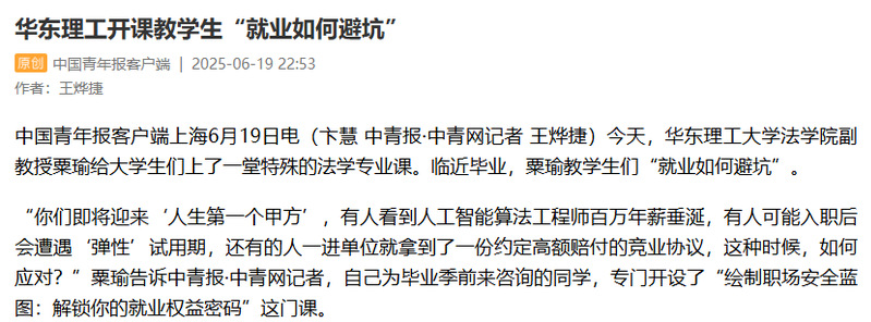 6月19日,在华东理工大学法学院副教授粟瑜为毕业生们带来“绘制职场安全蓝图:解锁你的就业权益密码”讲座。央视新闻客户端、光明日报客户端、中国教育报客户端、中国新闻网、中国青年报客户端、解放·上观、文汇·上观、科学网、青春上海、东方网、上海教育新闻网、第一教育等10余家媒体进行了原发报道。本篇选取了部分报道予以转载。