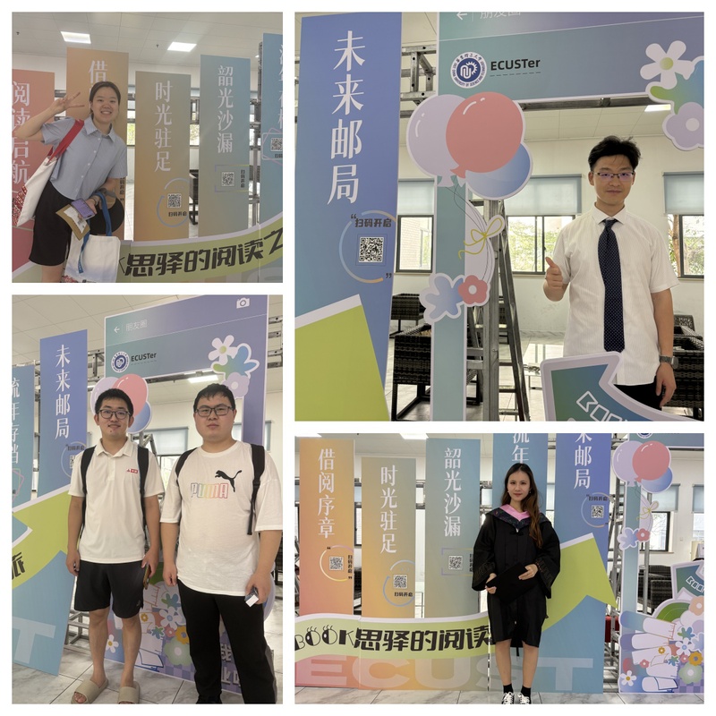 与此同时,图书馆在徐汇校区208读者服务大厅打造了“【BOOK 思驿】的阅读之旅”主题展板。展板分为“阅读启航”“借阅序章”“时光驻足”“韶光沙漏”“流年存档”“未来邮局”6大板块,毕业生只需扫码,便能开启专属的阅读回忆之旅。最后的“未来邮局”板块更是成为毕业生们倾诉心声的平台。大家纷纷扫码留言,有人希望在研究生阶段继续保持阅读的热情;有人写下对未来的期许,渴望学业有成、生活顺遂。一句句真挚的感言,饱含着对过去的眷恋与对未来的憧憬。