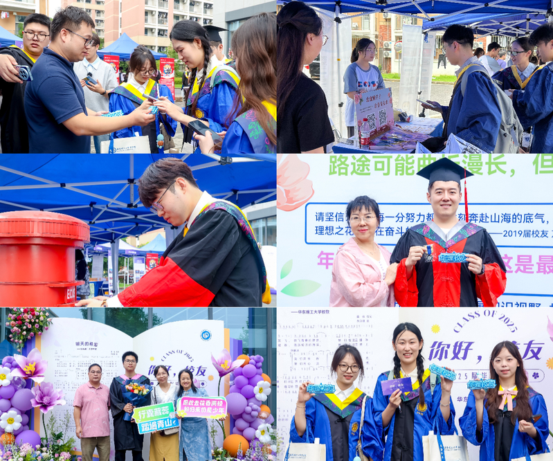 毕业典礼当日,“再见,同学!你好,校友!”线下路演活动在徐汇校区第一食堂广场火热开展,吸引千余名同学参与。校友身份线上激活让新校友们即时拥有专属的校友“电子名片”,紧密连接起与母校和校友的网络;基金会路演展示了基金会在支持学校发展、支持学生成长等方面的重要作用,传递了校友回馈母校的温暖力量;上海校友会俱乐部招新、地方校友会迎新活动报名、行业校友会纳新等环节,为新校友搭建了融入多元校友组织的平台,助力他们在职业发展中获得来自前辈校友的支持,在海内外校友网络的联动中感受华理大家庭的关怀与传承;“与理同行一路繁花”合影留念区则成为了毕业生们打卡的热门地点,大家纷纷在此定格与母校的美好回忆。现场还特别设置了“华理校友身份认证”包挂、明信片、年级及班级联络员身份徽章领取等环节,这些承载着母校印记的小纪念品,满载着校友会对新校友的深切关怀与期待。