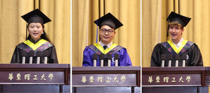 资源与环境工程学院本科毕业生赵彬弘代表本科生发言。她从知行合一的科研探索之路、突破边界的多维成长之径、胸怀寰宇的全球担当之志三方面回顾了在华理的学习成长经历,表达了把个人的理想追求与国家的前途、民族的命运紧密相连的远大志向。信息科学与工程学院硕士毕业生张于波代表研究生发言。作为首批工程硕博士培养改革专项的研究生,张于波分享了在华理和中国商发校企联合培养下,投身国产商业航空发动机研发,致力于解决“卡脖子”难题的科研故事,发出了“以华理所学,铸国之重器”的誓言。来自意大利的马浩同学代表留学生发言。他表示四年留学生涯,让他爱上了华理,爱上了中国,在每天的日常生活中,他都能看到中国正用科技改变着世界,他愿意做新时代的马可·波罗,用自己的镜头传播中国声音,用自己的行动促进文明互鉴。