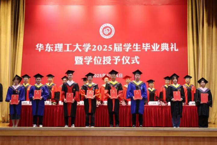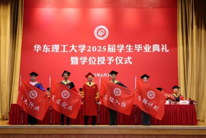 副校长王慧锋宣读了学位授予决定,共3647人获学士学位,3826人获硕士学位,534人获博士学位。校党委副书记宋来宣读了优秀毕业生和优秀团员表彰决定,425人获得2025届上海市优秀毕业生称号,793人获得2025届华东理工大学优秀毕业生称号,221名赴基层、西部及重点行业领域就业代表获得校级优秀团员称号。