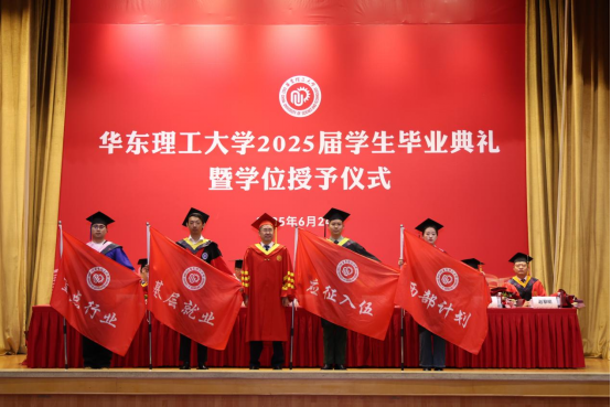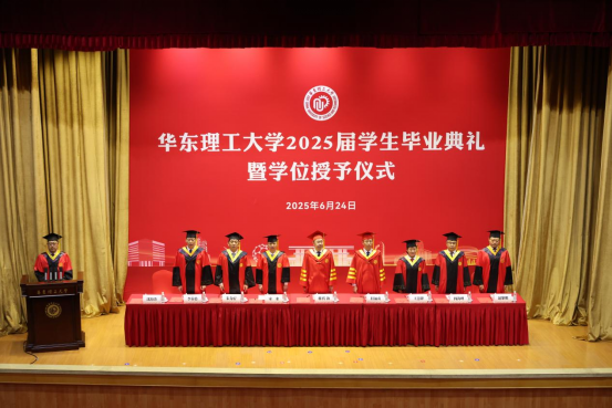 6月24日,华东理工大学2025届学生毕业典礼暨学位授予仪式在徐汇校区逸夫楼报告厅举行。校党委书记蒋传海,校长、校党委副书记轩福贞,校党委副书记宋来,副校长王慧锋、朱为宏、阎海峰、李春忠、赵黎明等校领导,以及各学院、职能部门负责人,专任教师代表、管理服务人员代表、校友代表、用人单位代表参加典礼。毕业典礼由校党委副书记沈海涛主持。