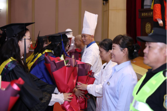 在发言环节之后,毕业生代表向教师、校友、用人单位代表和管理服务人员代表献上鲜花表达感恩之心。校领导为2025届班级联络员代表颁发了聘书。