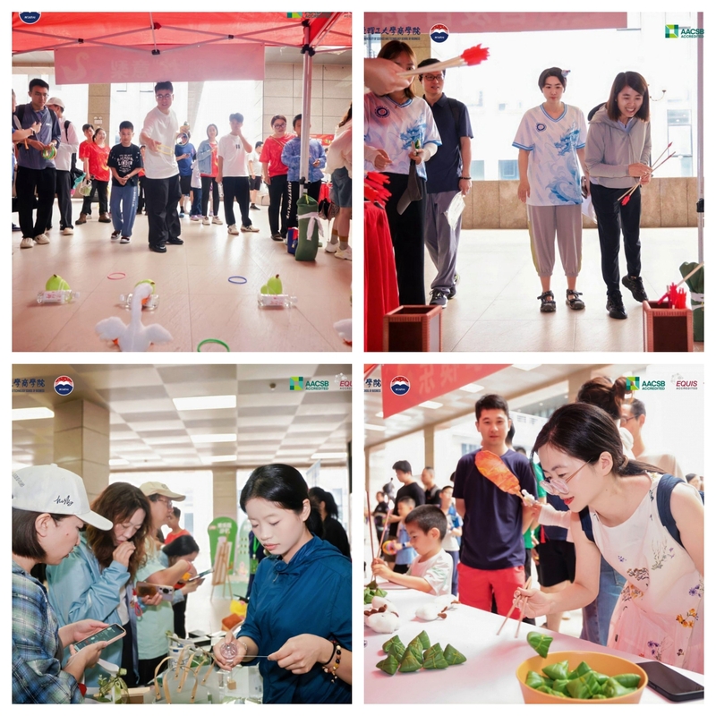 比赛日上午,主办方精心打造的端午主题游园会点燃了现场热情。雅趣投壶、欢乐套圈、指尖夹粽、成语闯关等一系列富含传统韵味的互动游戏,让师生和亲子家庭流连忘返,踊跃参与。同时,商学院进一步深化“乐教在奉贤”品牌内涵,将其与学生实践创新相结合,精心打造的实践展销摊位。师生共同参与运营,在奉贤校区体验“创业”过程,于实践中提升综合能力,生动诠释了寓教于乐的理念。