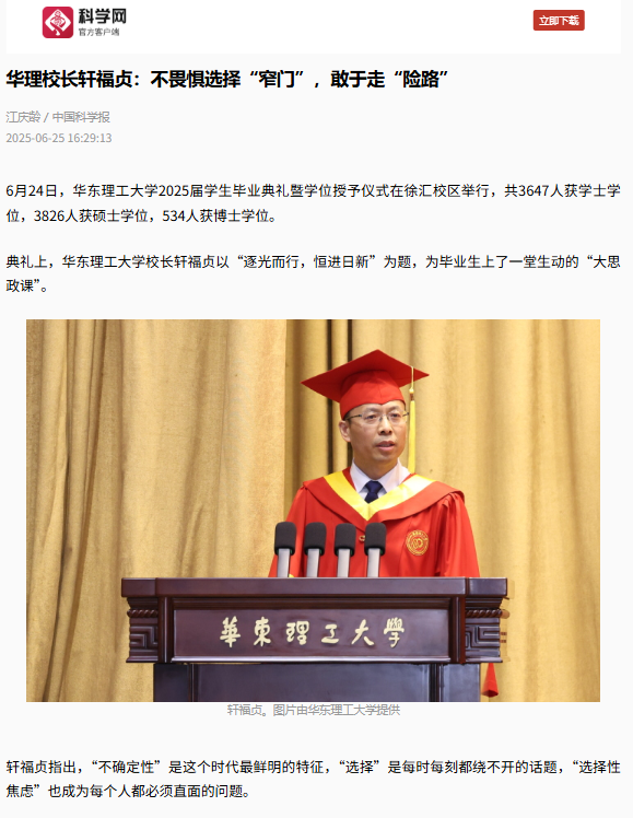 【文汇·上观】华东理工大学校长轩福贞寄语毕业生:不畏惧选择人生道路上的“窄门”