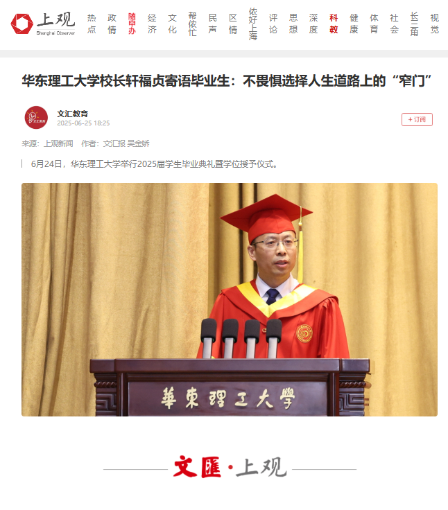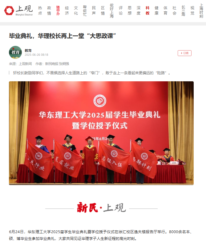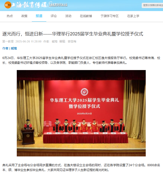 6月24日,华东理工大学2025届学生毕业典礼暨学位授予仪式举行。校长轩福贞以 “逐光而行,恒进日新”为题,为毕业生上了一堂生动的“大思政课”。典礼采用了主会场与分会场同步直播的方式,8000余名本、硕、博毕业生参加毕业典礼,大家共同见证华理学子人生新征程的高光时刻。解放·上观、文汇·上观、新民·上观、科学网、东方网、上海教育新闻网、上海科技报、第一教育、上海热线、话匣子近10余家媒体进行了原发报道。本篇选取了部分报道予以转载。