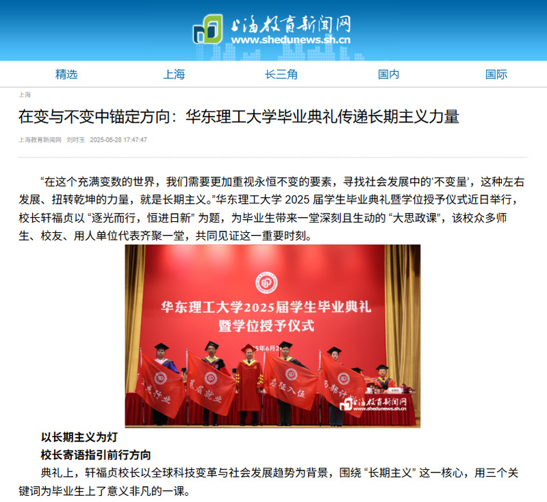 【上海教育新闻网】在变与不变中锚定方向:华东理工大学毕业典礼传递长期主义力量