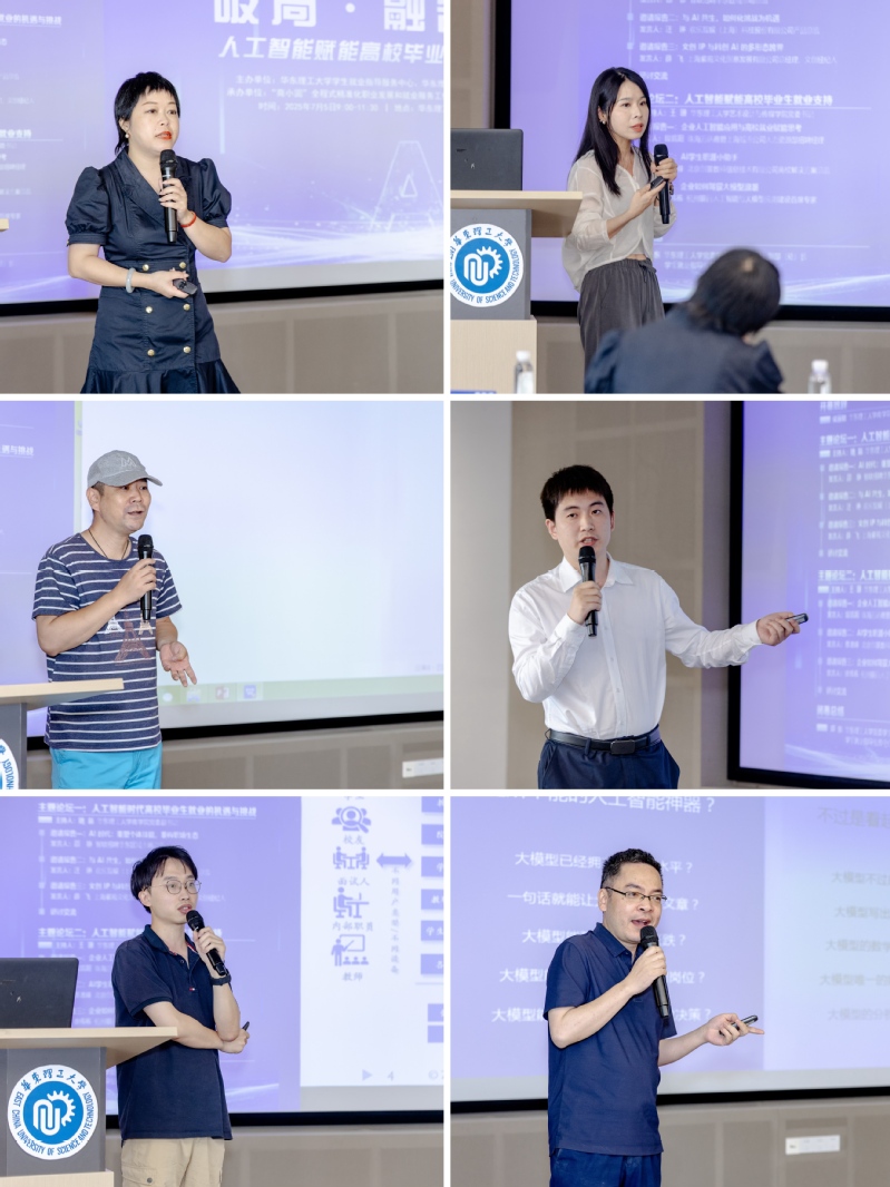 商学院党委书记侯丽敏,艺术设计与传媒学院党委书记王珊,校党委办公室副主任陈庆升,校党委学生工作部(处)副部(处)长、学生就业指导服务中心主任郑东,商学院党委副书记姚磊以及智联招聘、珠海万达商管、杭州银行、北京创景、欢乐互娱、上海紫苑文创等知名企业的专家和高校就业工作者齐聚一堂,共同探讨人工智能赋能高校毕业生就业支持体系的建设路径。