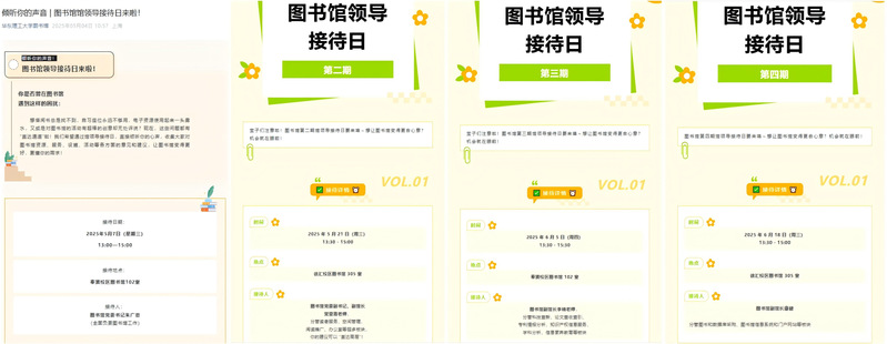 图书馆党委积极开展开门教育,深入践行“为民服务”。为掌握一手情况、靠前服务读者,馆领导接待日制度于本学期正式建立。4位馆领导轮流值守,面对面听取读者(或员工)意见。对收集到的问题实行“简单问题立行立改,复杂问题限期督办”。制度落地以来,在图书馆党委推动下,“奉贤校区图书馆读者物品无序堆放”这一管理顽疾取得明显改善,馆内环境秩序焕然一新,读者满意度大幅提升。‍