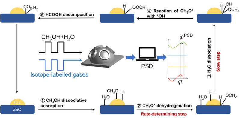氢能作为一种清洁高效的能源载体,在构建未来可持续能源体系中具有重要战略地位。其中,甲醇水蒸气重整(methanol steam reforming, MSR)因其反应条件温和、氢气产率高而成为最具应用前景的制氢技术之一。铜基催化剂凭借其优异的活性和较低的CO选择性在该反应中展现出独特优势。然而,现有研究对MSR反应中活性位点的本质认识仍存在争议,对反应机制的阐释也多基于静态条件下的实验结果,这严重制约了高性能催化剂的理性设计。