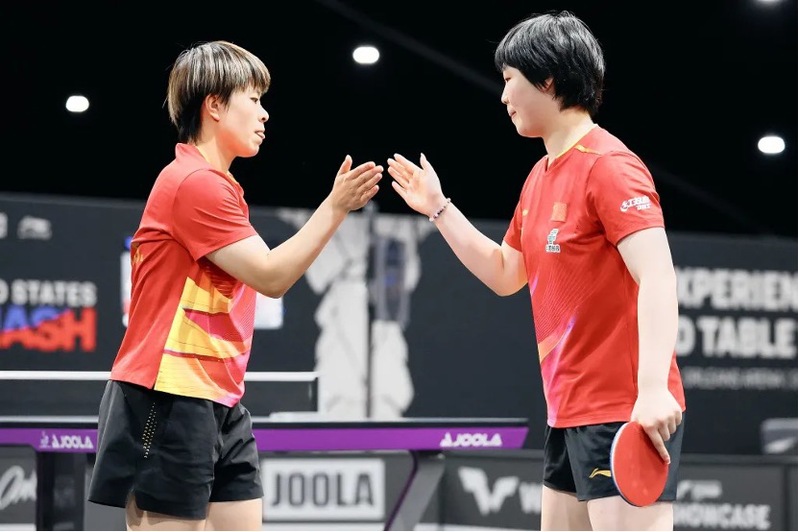 图片说明:WTT美国大满贯赛女双冠军王艺迪(左)、蒯曼