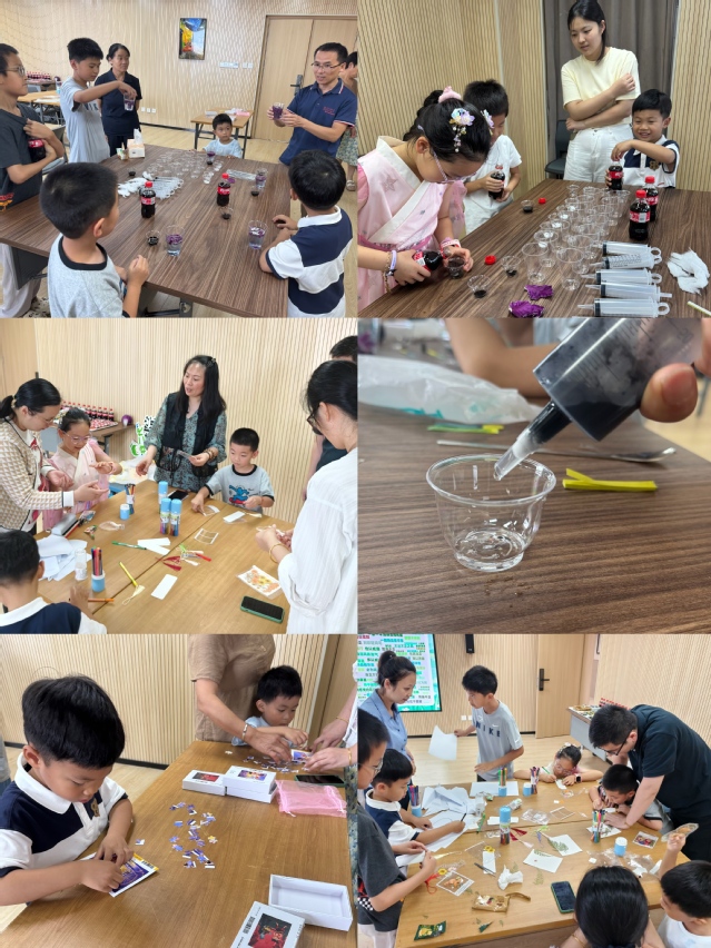 在特色活动环节,材料实验教学中心陈健壮老师带领孩子们动手体验了“甘蓝苏打变色”“可乐变清水”等趣味科学实验,不仅讲解了“酸碱指示剂”“活性炭吸附”等科学原理,更引导孩子们从直观的实验现象中感受“清廉如水,污浊如腐”的寓意。随后的手工环节中,孩子们结合廉洁名言警句,发挥创意,用彩笔在空白书签上精心绘制图案、书写警句,将清正廉洁的理念悄然融入日常阅读中。拼图游戏环节则通过趣味PK互动展开,一幅幅生动的廉洁动画形象逐渐完整呈现,孩子们在动手动脑间加深了对廉洁价值观的感悟。