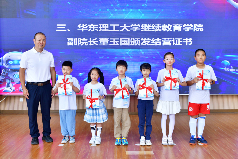 7月14日下午,2025年“华二代”暑期科技夏令营闭营仪式在华东理工大学附属小学体操房举行。华东理工大学附属小学校长张黎敏、华东理工大学工会副主席张攀、继续教育学院副院长董玉国、“华二代”夏令营家委会主任朱丽丽与家委会成员及全体营员共同见证了这场充满科技与温情的结营仪式。