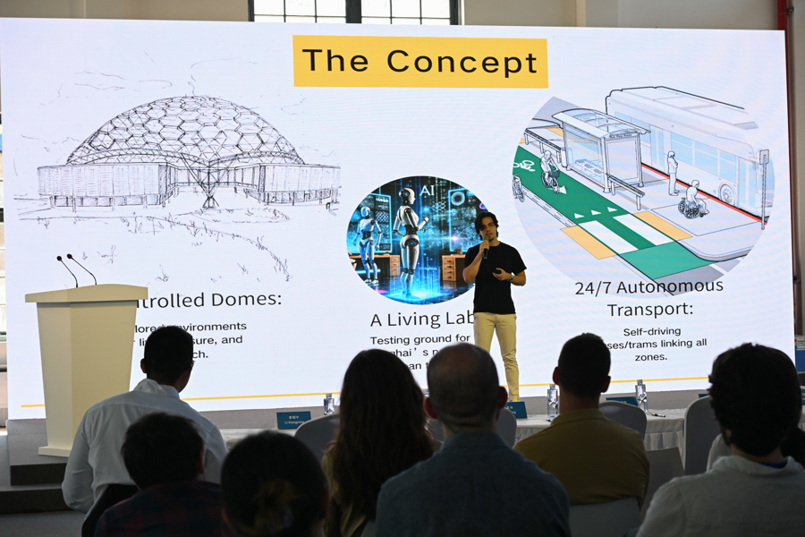 学生们的作品,亮点频现。工业地标变身5分钟活力社区——混合功能+动态交通,打造包容生长的城市“共生体”,这是同学们眼中的“人民复兴岛”。“数字复兴岛”应当是什么模样?打造未来科技乐园——无人机枢纽+数字迷宫,虚实交互激活全龄化工业遗产新玩法。“设计复兴岛”用设计说话,双轴激活“城市插件”——步行廊桥+运河复兴,重新接入上海都市生活圈。