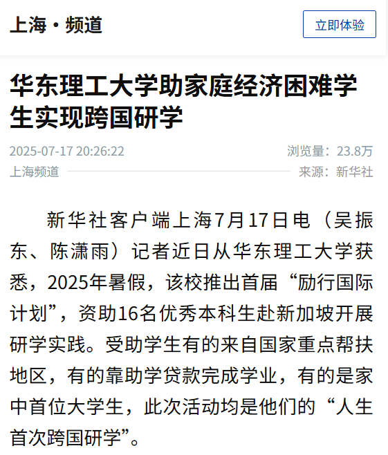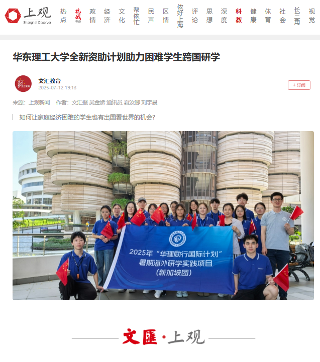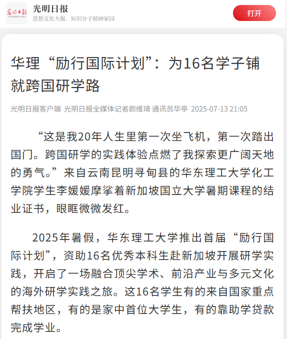 2025年暑假,华理推出首届“励行国际计划”,资助16名家庭经济困难的优秀本科生赴新加坡开展研学实践,开启了一场融合顶尖学术、前沿产业与多元文化的海外研学实践之旅。人民日报客户端、光明日报客户端、中国日报、解放·上观、文汇·上观、新民·上观、《青年报》、话匣子、上海教育新闻网、第一教育等10余家媒体对此进行了相关报道。
