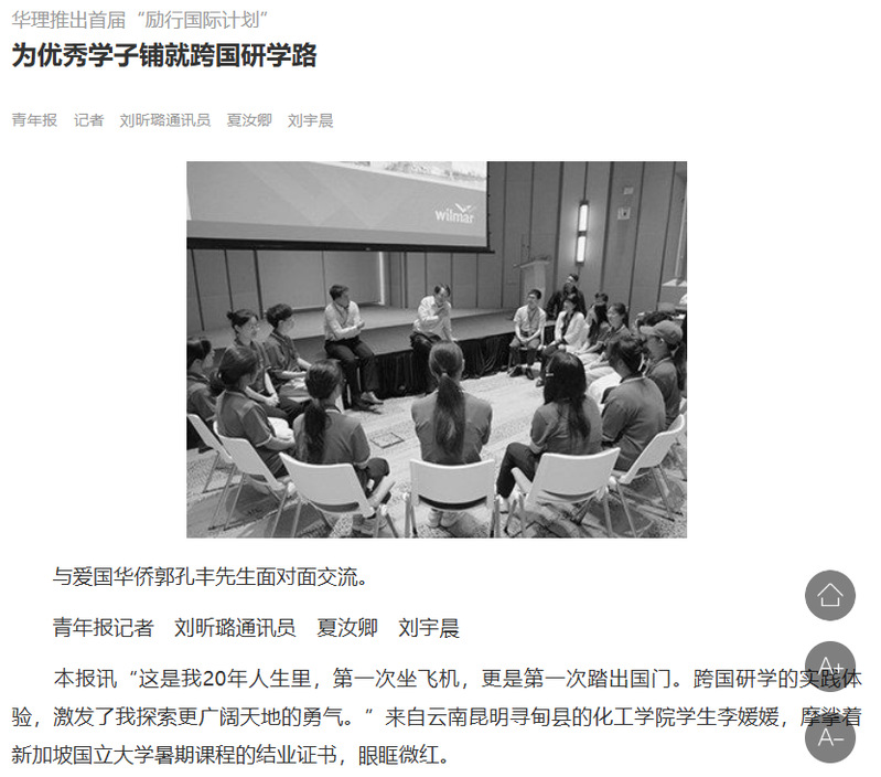 如何拓宽学生全球视野,培养具有国际视野的卓越拔尖创新人才?如何让家庭经济困难的学生也有出国看世界的机会?文汇报记者了解到,今年暑期,华东理工大学推出首届“励行国际计划”,资助16名优秀本科生赴新加坡开展研学实践。这群学生中,有的来自国家重点帮扶地区,有的是家中首位大学生,有的靠助学贷款完成学业。