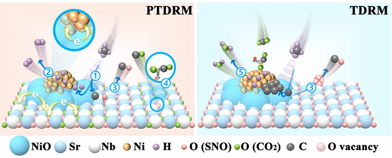 利用甲烷干重整反应(DRM)将温室气体CH4与CO2转化为合成气(H2和CO),为碳资源高值化利用提供了极具前景的技术路径。然而,开发兼具高活性与长寿命的DRM催化剂仍是该领域的核心挑战:一方面,在C-H键有效断裂所需的高温区(>700℃),金属烧结现象普遍存在。另一方面,在金属烧结风险较低的中低温区(<600℃),反应受限于热力学平衡,且逆水煤气变换(RWGS)副反应占据主导地位,导致催化活性与稳定性同步显著下降。光热催化甲烷干重整(PTDRM)借助光热与光电子过程的耦合作用,可在较低温度下驱动DRM反应。但目前PTDRM存在实际光利用率低、合成气生成速率难以媲美热催化、RWGS副反应难以有效抑制等问题,严重制约了其向实际应用的推进。