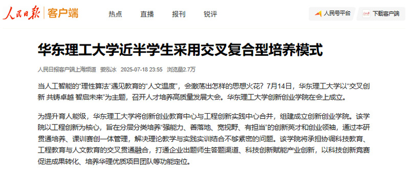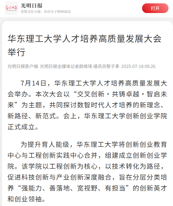 7月14日,华东理工大学人才培养高质量发展大会举办。本次大会以“交叉创新·共铸卓越·智启未来”为主题,共同探讨数智时代人才培养的新理念、新路径、新范式。会上,华东理工大学创新创业学院正式成立。央视新闻客户端、人民日报客户端、光明日报客户端、中国日报网、中国教育新闻网、中国青年报客户端、中国社会科学网、中证网、中国新闻网、科学网APP、中化新网、文汇·上观、新民·上观、青春上海、东方网、劳动观察、新民周刊、上海教育新闻网、第一教育、上海科技报、话匣子、上海热线、上海徐汇、广州日报新花城等20余家媒体进行了原发报道。本篇选取了部分报道予以转载。