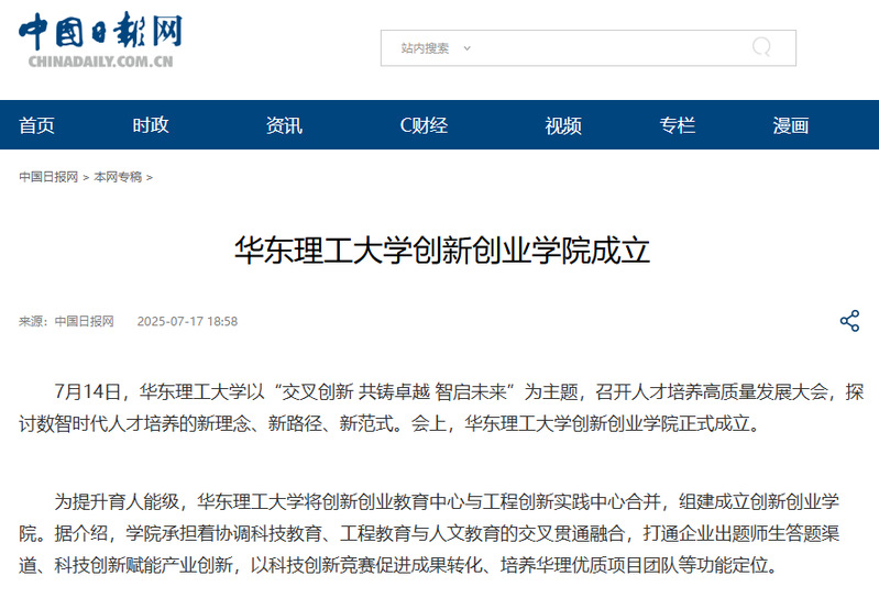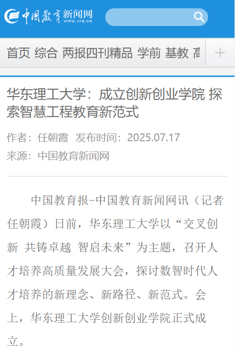 【中国教育新闻网】华东理工大学:成立创新创业学院 探索智慧工程教育新范式