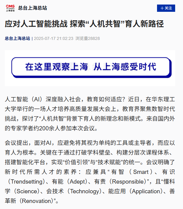【央视新闻客户端】应对人工智能挑战 探索“人机共智”育人新路径