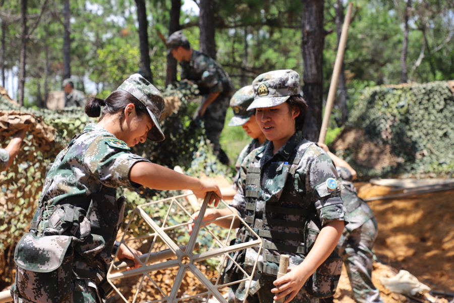 在为期10天的野外演习中,山区地形复杂、条件艰苦,常有野生动物出没。体感温度高达40摄氏度的炙烤下,刘姿含与战友们身负30余斤的子弹袋和装备进行作业。