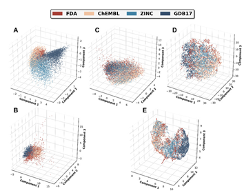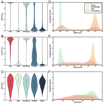 团队在多类数据集上系统评估了CLaSP:以FDA批准药物与其他国家/地区批准药物(Worlddrug)为正例集;以ChEMBL、ZINC(可购买化合物数据库)和GDB17(虚拟化学空间)为对照库;并引入WITHDRAWN(已撤市药物)与Investigation(在研药物)等真实集合进行外部检验。结果显示,CLaSP能输出可与药物优化流程直接对接的综合评分,在不同数据来源与化学空间上均表现出良好的判别力与适用性,具有较强的应用潜力(图2)。