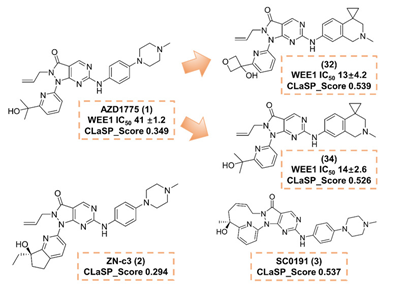 为验证评分体系的应用价值,作者针对Wee1抑制剂开展了案例研究:与不良反应事件相关的AZD1775与ZN-c3在CLaSP评分中处于较低水平;相较之下,优化后的化合物32、34以及目前在研的化合物3获得更高评分,显示出良好的优化潜力(图3)。