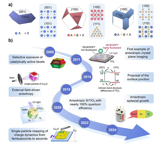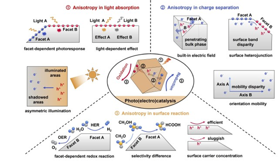 单晶半导体因其可控的晶体取向和高度有序的结构构型,为构建高效能量转化的光(电)催化体系提供了重要材料基础,其光(电)催化性能普遍呈现出明显的晶面/晶向依赖性,即本征的各向异性行为。华东理工大学杨化桂教授于2008年率先提出无机非金属离子调控晶态半导体取向生长的理论(Nature, 2008, 453, 638. 引用4500余次),开创了基于各向异性晶面结构设计光(电)催化材料的研究范式。近年来的研究进一步表明,晶体各向异性广泛影响光吸收能力、光生载流子的迁移路径、表面活性位点的分布及关键中间体的吸附与转化机制。因此,仅依赖材料的整体组成或宏观结构已难以准确预测其光(电)催化行为。同时,单晶材料在界面结构设计、晶面精确调控及器件集成兼容性等方面仍面临诸多挑战,限制了其实际应用的拓展。