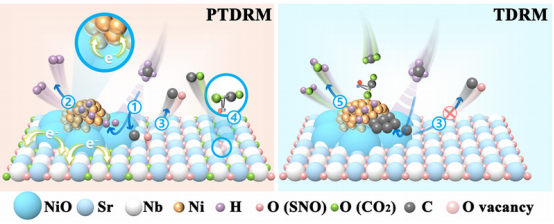 中低温条件下Ni0-NiO-Sr2Nb2O7光热与热催化甲烷干重整过程示意图