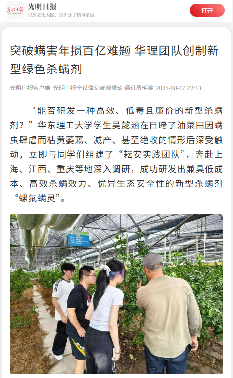 【光明日报客户端】突破螨害年损百亿难题 华理团队创制新型绿色杀螨剂