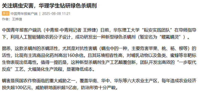 近日,华理团队利用AI辅助农药分子设计,在分子中创新性引入三氟甲硫基,最终成功研发出具有显著优势的新型杀螨剂(暂定名为“螺氟螨灵”),实现了杀螨效力显著跃升、生态安全性优异、生产工艺颠覆创新三大技术飞跃。央视新闻客户端、光明日报客户端、中国新闻网、中国青年报客户端、中化新网、科学网、青春上海、上海科技报、第一教育等近10家媒体进行了原发报道。本篇选取部分报道予以转载。