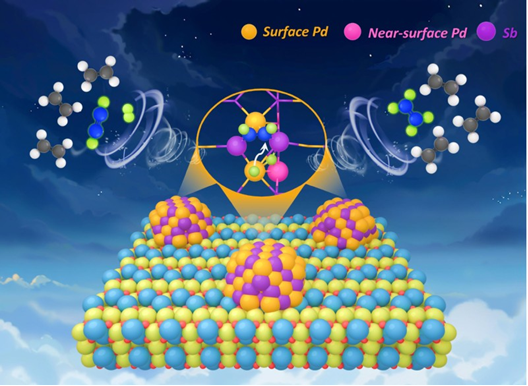 近日,华东理工大学催化反应工程团队段学志教授、曹约强特聘研究员基于吸附构型匹配策略在炔烃加氢催化剂创制方面取得新进展,构建兼具表面Pd1Sb2三原子位点与近表面Pd位点(Pdns)的PdSb金属间化合物催化剂,实现烃类吸附与氢气活化位点的空间解耦,突破了加氢反应活性与选择性平衡制约。相关研究成果在线发表于《美国化学会志》。