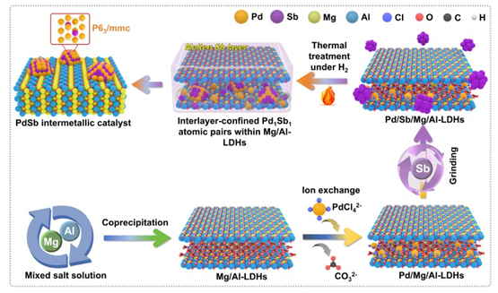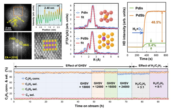 该团队利用Pd/Mg/Al-LDHs的层间限域效应实现Pd原子原位捕获熔融Sb原子,经过高温诱导有序化生成稳定的PdSb金属间化合物催化剂。球差电镜和X射线吸收谱解析了其表面Pd1Sb2三原子位点及近表面Pd位点的独特结构特征。结合吸附构型解析、HD同位素交换及原位红外光谱等机理研究手段,发现表面Pd1Sb2位点可以匹配炔烃的σ-吸附构型以及烯烃的π-吸附构型;同时,Pd1Sb2邻近的近表面Pd位点与其协同实现了H2自发解离。催化性能评价结果表明,该PdSb催化剂在模拟工业条件下,实现了乙炔和丙炔的100%转化,其中乙炔半加氢的乙烯选择性高达96.50%,丙炔半加氢的丙烯选择性高达98.65%,显著优于目前已报道的Pd基催化剂。