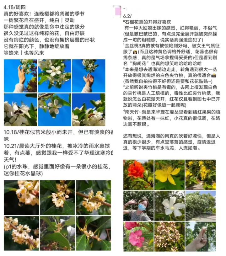 周颖的这一爱好,源自语文老师的启发,高考后便开始用心感受四时之美。在她看来,“植物的生命在一年年的发芽、开花、结果中循环,每一种植物都有自己的可爱之处”。