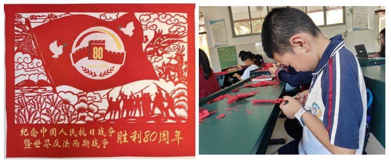 图片说明:王桐予完成《山河同庆·盛世千秋》剪纸作品并教仁德一小学生剪纸