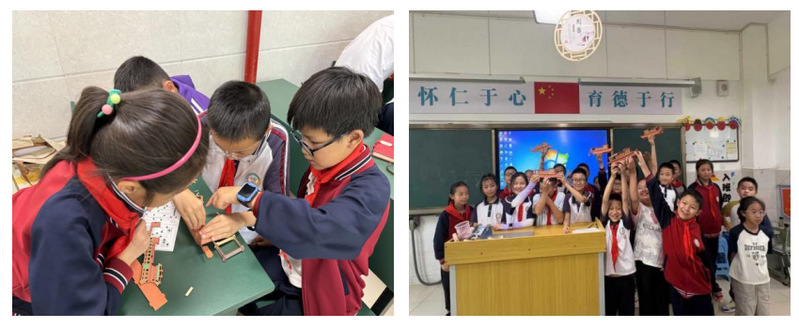 图片说明:学生认真拼装、展示自己所制作的木船模型