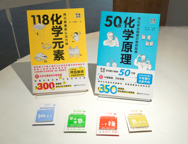 围绕学校优势学科和专业特色,近年来,校出版社在科学普及领域也出版了众多优秀作品。继我校作者戴升教授的畅销书《118化学元素》之后,在本次书展现场,其新书《50条化学原理》,以及校出版社与上海科技馆合作的《你好!前沿科技》系列新书也受到了读者的追捧。在此基础上,校出版社创新推出了“化里有话”系列图书周边文创新品,成为展位最畅销的文创产品。该系列以化学元素为灵感,通过“钠咋了”“氦有谁”“禁止焦氯”“一个镱”等谐音趣味徽章冰箱贴,让化学知识以轻松幽默的方式走进大众视野。此外,校出版社还发布了以118个化学元素为主题的原创桌游卡牌,通过互动游戏形式帮助青少年在娱乐中掌握化学基础知识,提升了科普的趣味性和传播力。