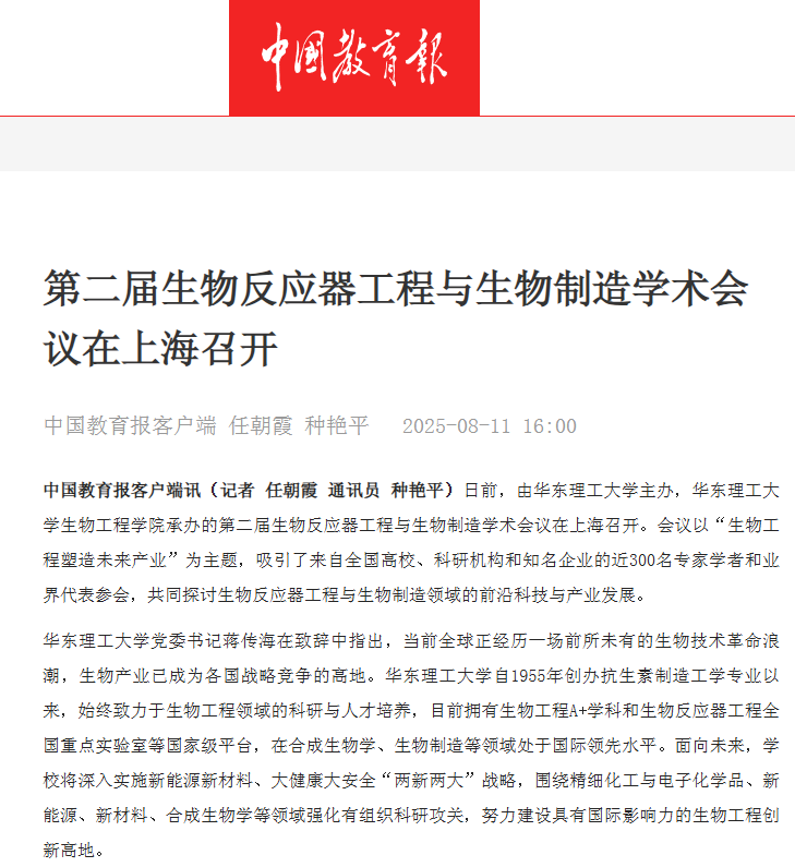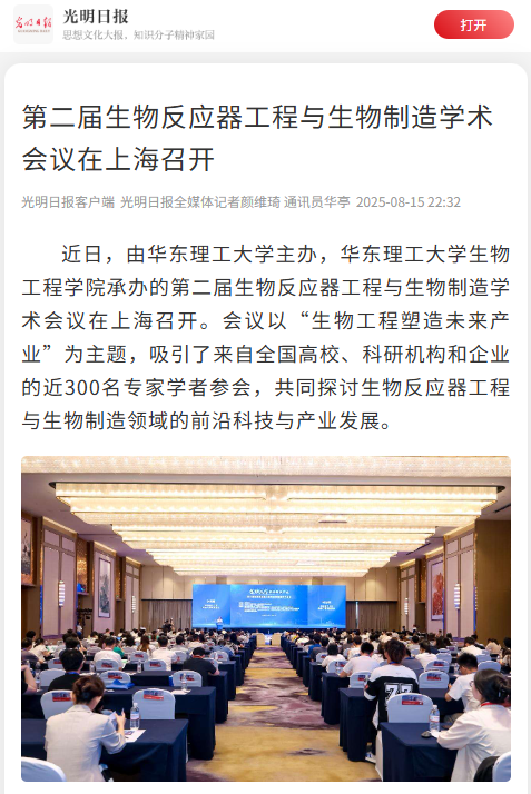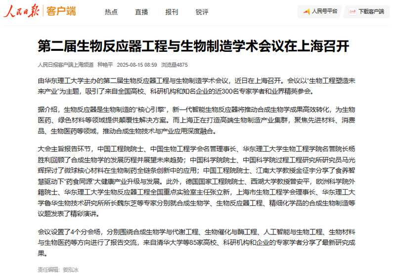 8月6日-8日,由华东理工大学主办,华东理工大学生物工程学院承办的第二届生物反应器工程与生物制造学术会议在上海召开。会议以“生物工程塑造未来产业”为主题,来自全国高校、科研机构和知名企业的近300名专家学者和业界精英参会,共同探讨生物反应器工程与生物制造领域的前沿科技与产业发展。人民日报客户端、光明日报客户端、中国新闻网、中国教育报客户端、科学网、中化新网、新民·上观、东方网、上海教育新闻网、上海科技报、第一教育、上海热线、劳动观察、话匣子、广州日报新花城等10余家媒体进行了原发报道。本篇选取部分报道予以转载。