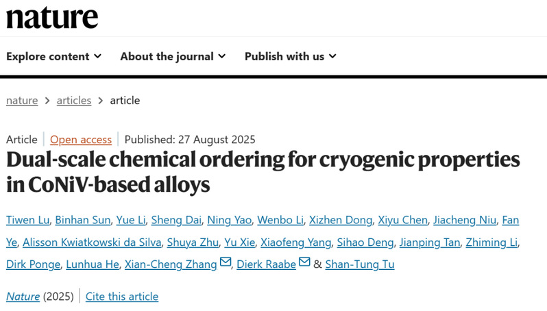 8月28日凌晨,华东理工大学机械与动力工程学院张显程教授、涂善东院士团队在Nature(《自然》)发表题为“Dual-scale chemical ordering for cryogenic properties in CoNiV-based alloys”的最新研究成果。