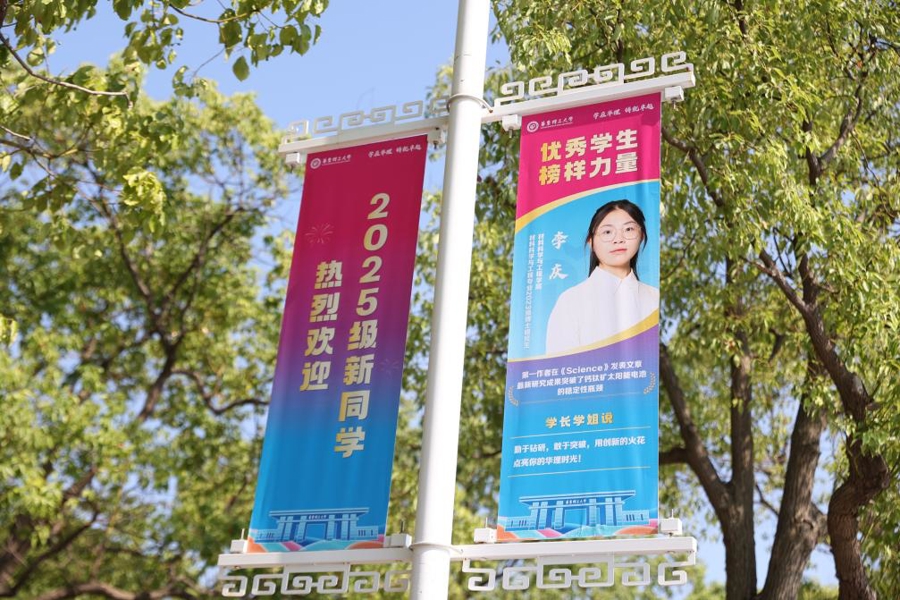 校园主干道上,一组组特别的道旗,吸引了众多新生驻足观看、合影留念。迎新季,华东理工大学在校园主干道两侧布设近百面“华理学子·榜样力量”主题道旗,聚焦学术科研、创新创业、社会实践、文体竞赛等领域的优秀学子,以人物风采展示和“学长学姐说”的温暖寄语,为新生打造了可感、可学的榜样标杆。青马工程“领航班”成员、校十佳青年志愿者、法学院大四学生李音洁说,“当看到自己的照片印在道旗上时,心中涌动的不仅是一份喜悦,更是一份责任。”