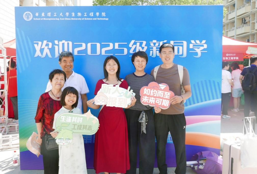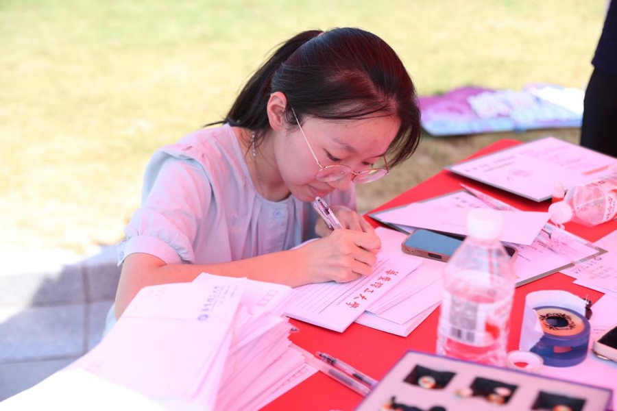 “早听说过王艺迪、王晓彤学姐的辉煌战绩,今天终于来到华理,还实地体验了乒乓球运动,果然人生当‘乒’搏!”新生在体育馆旁参与乒乓知识问答与颠球接力,感悟华理乒乓文化魅力;在南大门前的“时光邮局”,新生提笔给四年后的自己写信,家长则在旁写下鼓励话语;黄坡岭精神纪念碑旁的“德育课堂”,新生聆听领悟“652工程”历史;手性分子雕塑旁的“美育工坊”,新生体验扎染创作,亲手制作专属校园纪念品……