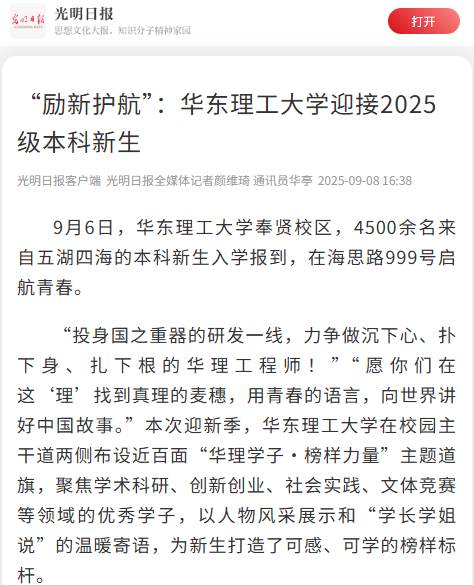 【光明日报客户端】“励新护航”:华东理工大学迎接2025级本科新生