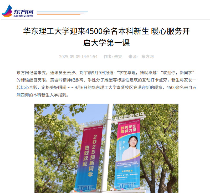 “学在华理,铸就卓越”“欢迎你,新同学”的标语醒目亮眼,黄坡岭精神纪念碑、手性分子雕塑等标志性建筑的互动打卡点旁,新生与家长一起比心合影,定格美好瞬间……9月6日,4500余名来自五湖四海的本科新生入学报到,在海思路999号启航青春。光明日报客户端、华山路有料青年、科学网APP、解放·上观、《青年报》、东方网、青春上海、上海教育新闻网、上海科技报、第一教育、话匣子以及上海教育电视台等10余家媒体进行了原发报道。本篇选取了部分报道予以转载。