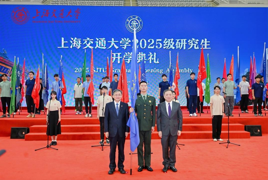 事实上,大阅兵当天,当武警部队方队亮相在电视屏幕中,交大闵行校区体育馆全场参训师生就以热烈的掌声和挥舞的红旗,向从武警上海总队选派进校的承训教官们致敬。9月14日,在同一片场地,上海交通大学2025级研究生新生开学典礼上,校长、中国科学院院士丁奎岭告诉新生们:“不久前举行的九三阅兵式,充分展现了我国国防科技领域的最新成就,让我们倍感振奋。在这背后,活跃着一批交大师生校友的身影,他们以祖国强盛为己任,深度参与核心装备研制工作,奋斗在铸造国之重器的第一线。”