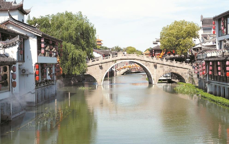 以朱家角镇为例,这里有石拱桥、石梁桥,还有石板平桥、折桥,和谐穿插于形态自由丰富的水网街巷中,凌波越河、连巷接屋、车马辐辏,自然成为街巷空间中的特色焦点。放生桥颇显气派,横跨淀浦河,始建于明隆庆五年(1571年),万历年间重修,清乾隆末年坍塌,嘉庆十七年(1812年)重建。它全长72米,是上海现存古桥中规模最大的五跨石拱桥,且造型优美,气势宏伟,至今能看清嘉庆年间重修时的刻石,周边环境保存较好,完美体现桥、河、街、镇相互依存的沪派江南集镇风貌。