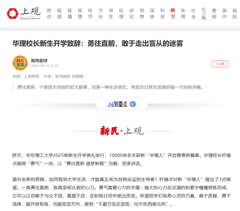 【新民·上观】华理校长新生开学致辞:勇往直前,敢于走出盲从的迷雾