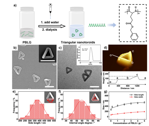 在向溶液中加水时,疏水的PBLG界面能上升,使得其自组装形成纳米纤维;提高溶液中的水量,导致聚合物分子链收缩产生内部应力,驱动纳米纤维卷曲形成圆形纳米环;继续提高溶液中的水量,使得聚合物链趋向于更紧密堆积,所产生的内部应力促使圆形环变形折叠最终形成三角形结构。在更高的水量下,三角形拓扑结构保持不变。