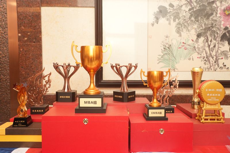 图片说明:华理EMBA组及MBA组获得的各项奖杯