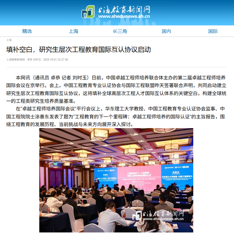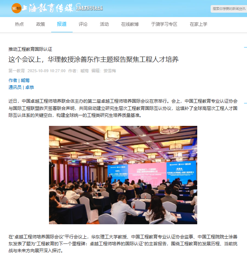 9月27日,在“卓越工程师培养国际会议”平行会议上,中国工程院院士、华东理工大学教授涂善东发表以“工程教育的下一个里程碑:卓越工程师培养的国际认证”为主题的主旨报告。科学网APP、东方网、上海教育新闻网、新民周刊、上海科技报、第一教育、话匣子等多家媒体进行了原发报道。本篇选取了部分报道予以转载。